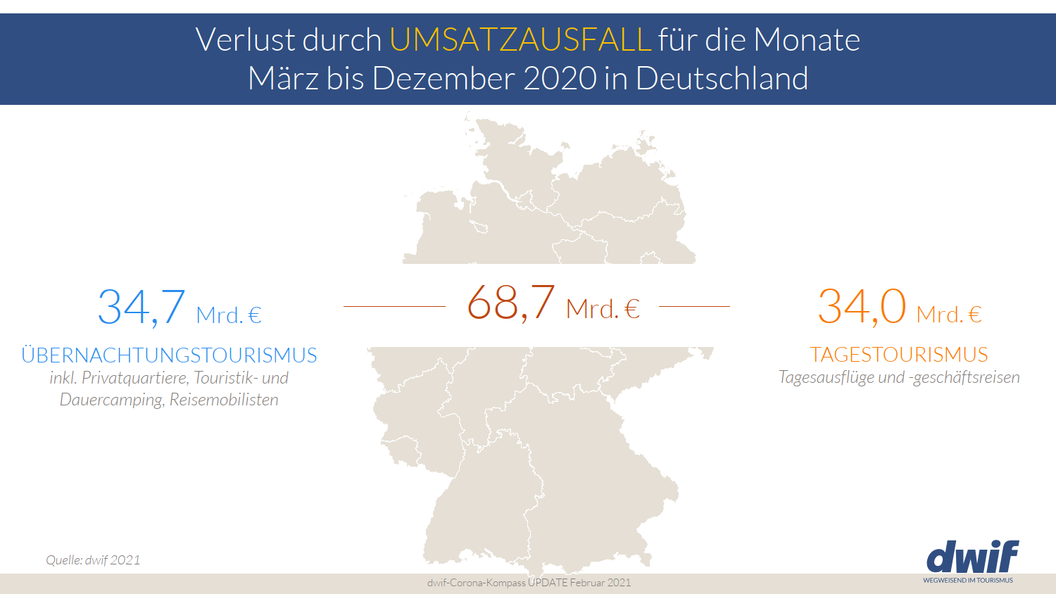 Nach aktuellen Berechnungen der Tourismusberatung dwif beläuft sich der Umsatzausfall in den Destinationen in Deutschland für den Zeitraum März bis Dezember 2020 auf 68,7 Mrd. Euro. Der Tages- und der Übernachtungstourismus sind davon fast gleichermaßen betroffen.