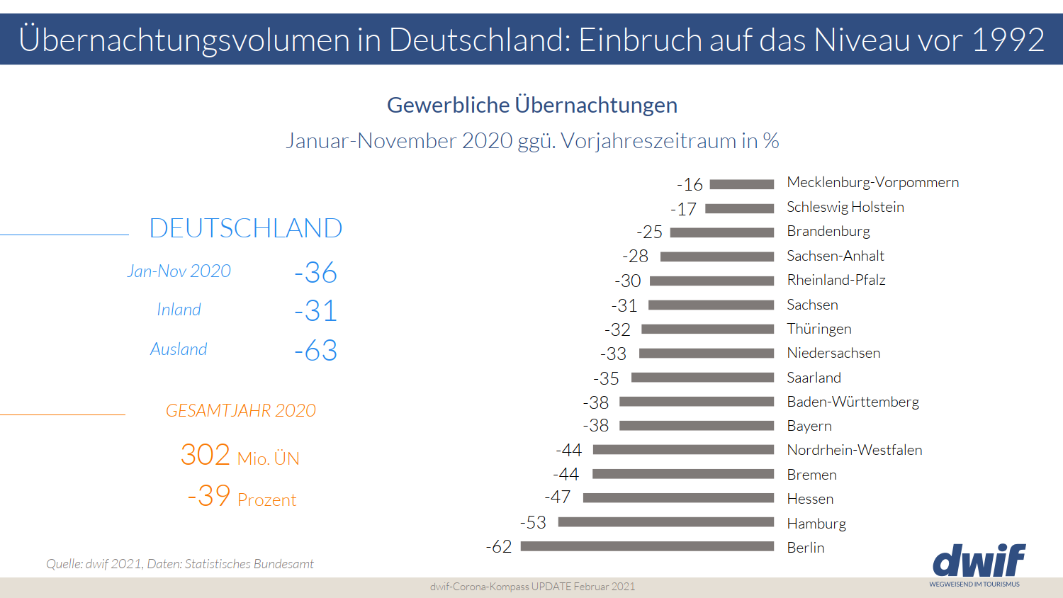 Rund 169 Mio. gewerbliche Übernachtungen weniger als im Vorjahreszeitraum. Das ist die Bilanz der Monate Januar bis November 2020 (Zahlen für den Dezember liegen für die einzelnen Reisegebiete noch nicht vor). Seit November befindet sich die Branche wieder im Lockdown und die Übernachtungsrückgänge im Zeitraum Januar bis November 2020 liegen in den Bundesländern zwischen 16 und 62 Prozent.