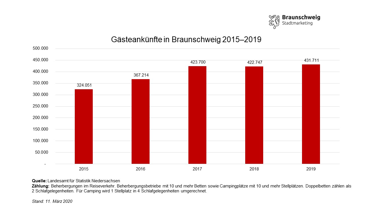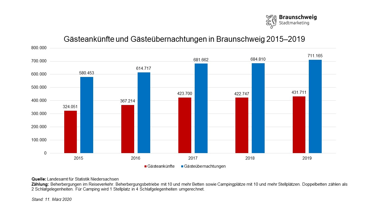 Mit Steigerungen um 3,9 Prozent bei den Übernachtungen und 2,1 Prozent bei den Ankünften im Vergleich mit dem Vorjahr kann die Braunschweiger Tourismusbranche auf ein erfolgreiches Jahr zurückblicken. 711.165 Übernachtungen und 431.711 Gästeankünfte 2019 markieren einen neuen Jahresrekord bei den Tourismuszahlen für Braunschweig. Die Zuwächse verteilen sich auf fast alle Quartale 2019, nur im zweiten Quartal gab es 0,5 Prozent weniger Gästeankünfte als im Vorjahr. Vergleichsweise stark war insbesondere das erste Quartal mit rund sechs Prozent mehr Ankünften und 7,7 Prozent mehr Übernachtungen in der Löwenstadt