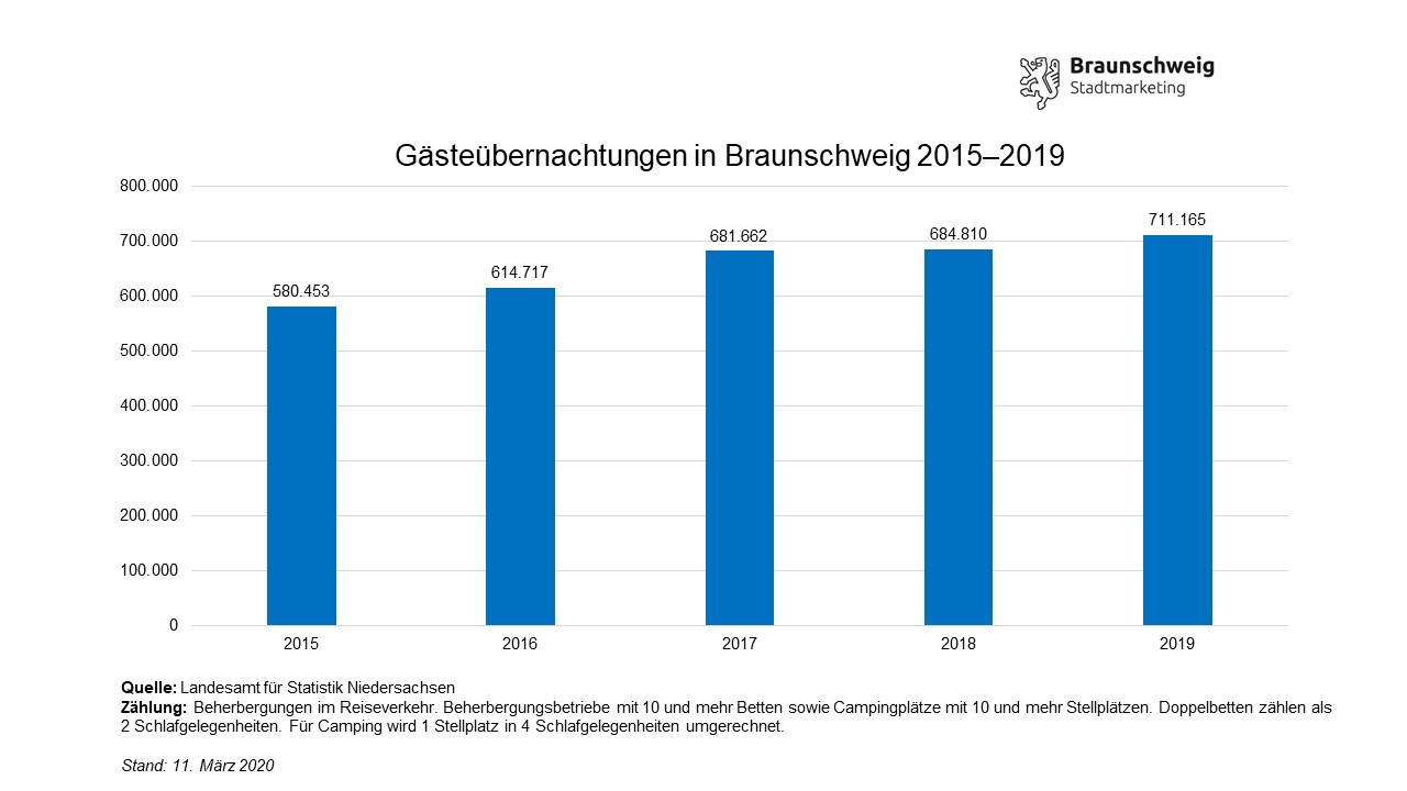 Nur drei Jahre, nachdem die Löwenstadt die 600.000er-Marke bei den Übernachtungen überschritten hat, knackt der Braunschweiger Tourismus die nächsten 100.000. Für das Jahr 2019 verzeichnet das Landesamt für Statistik Niedersachen (LSN) rund 711.000 Übernachtungen in Braunschweig. Einen neuen Bestwert erreichten mit fast 432.000 auch die Gästeankünfte.